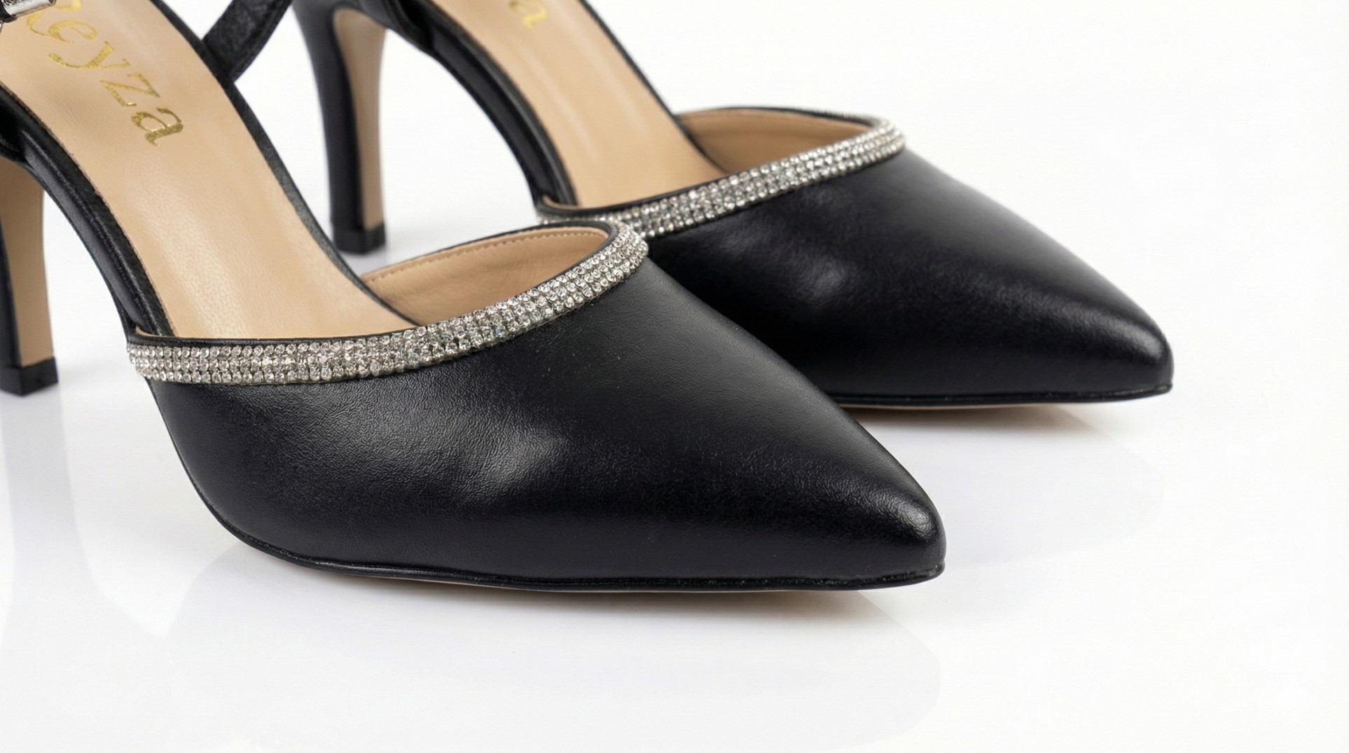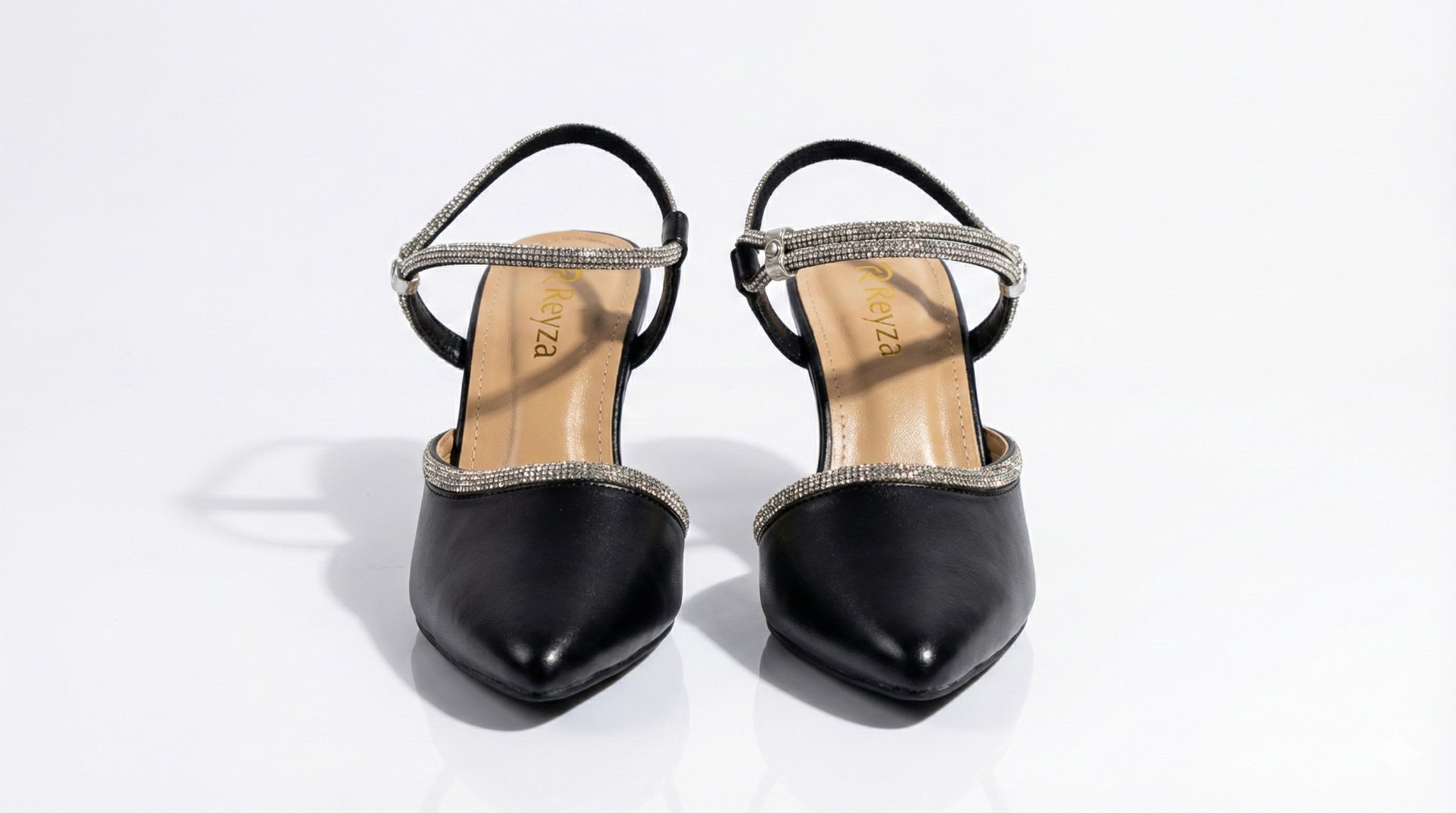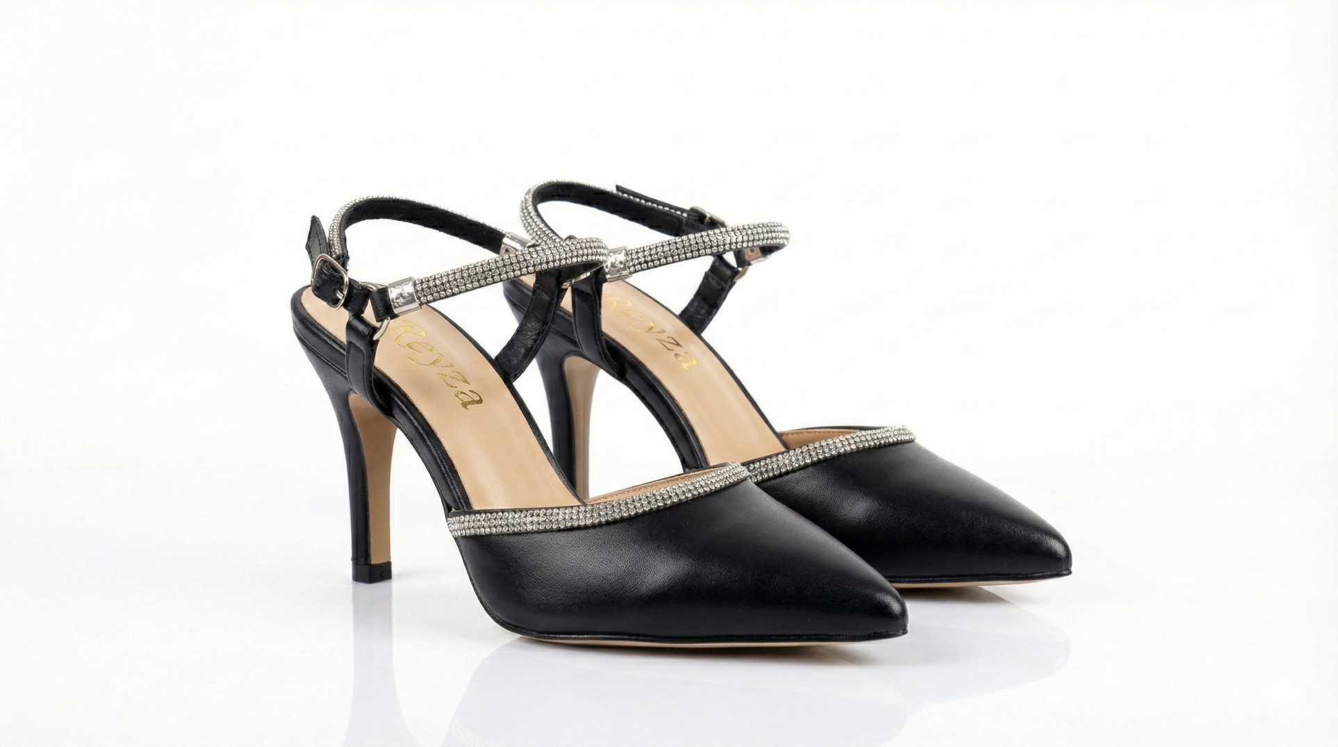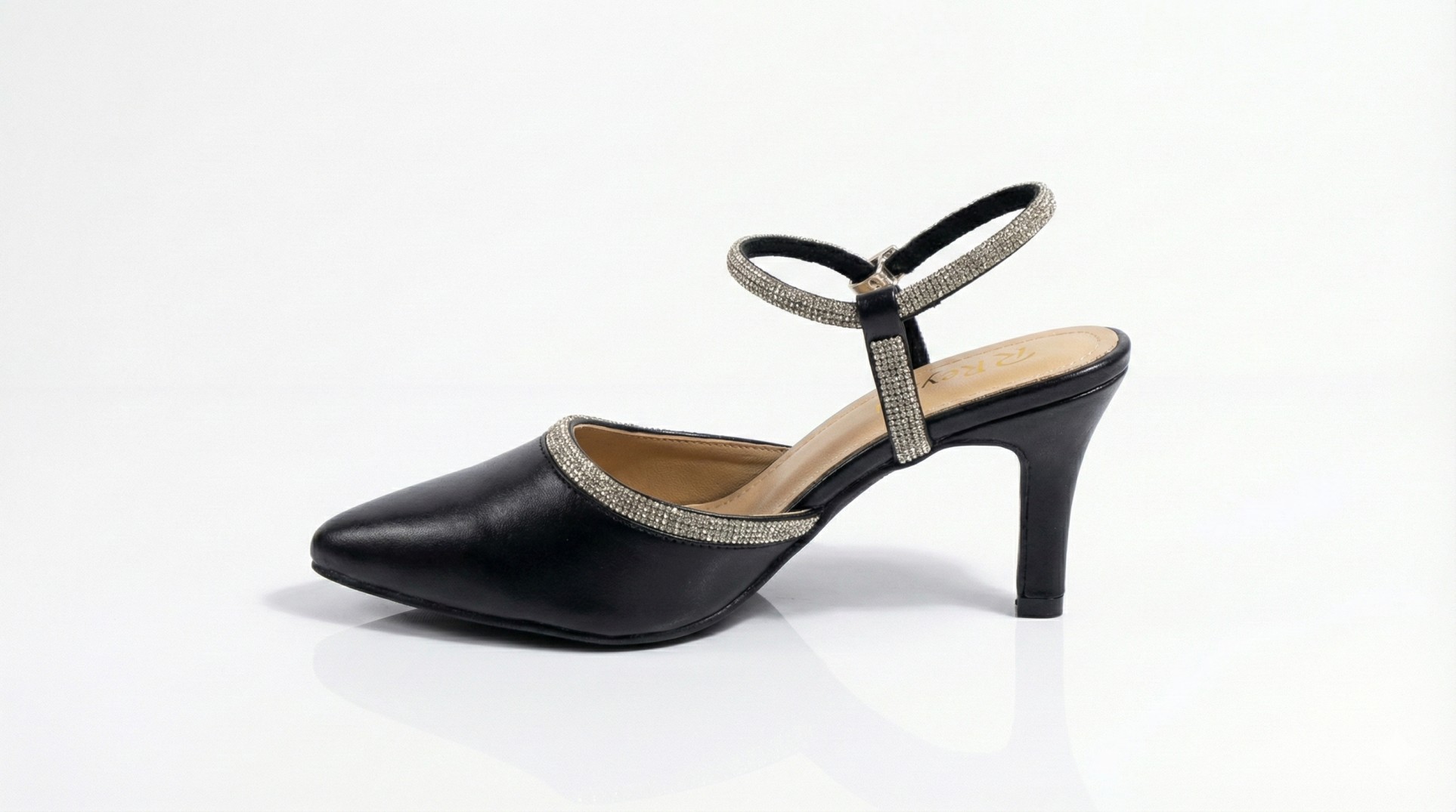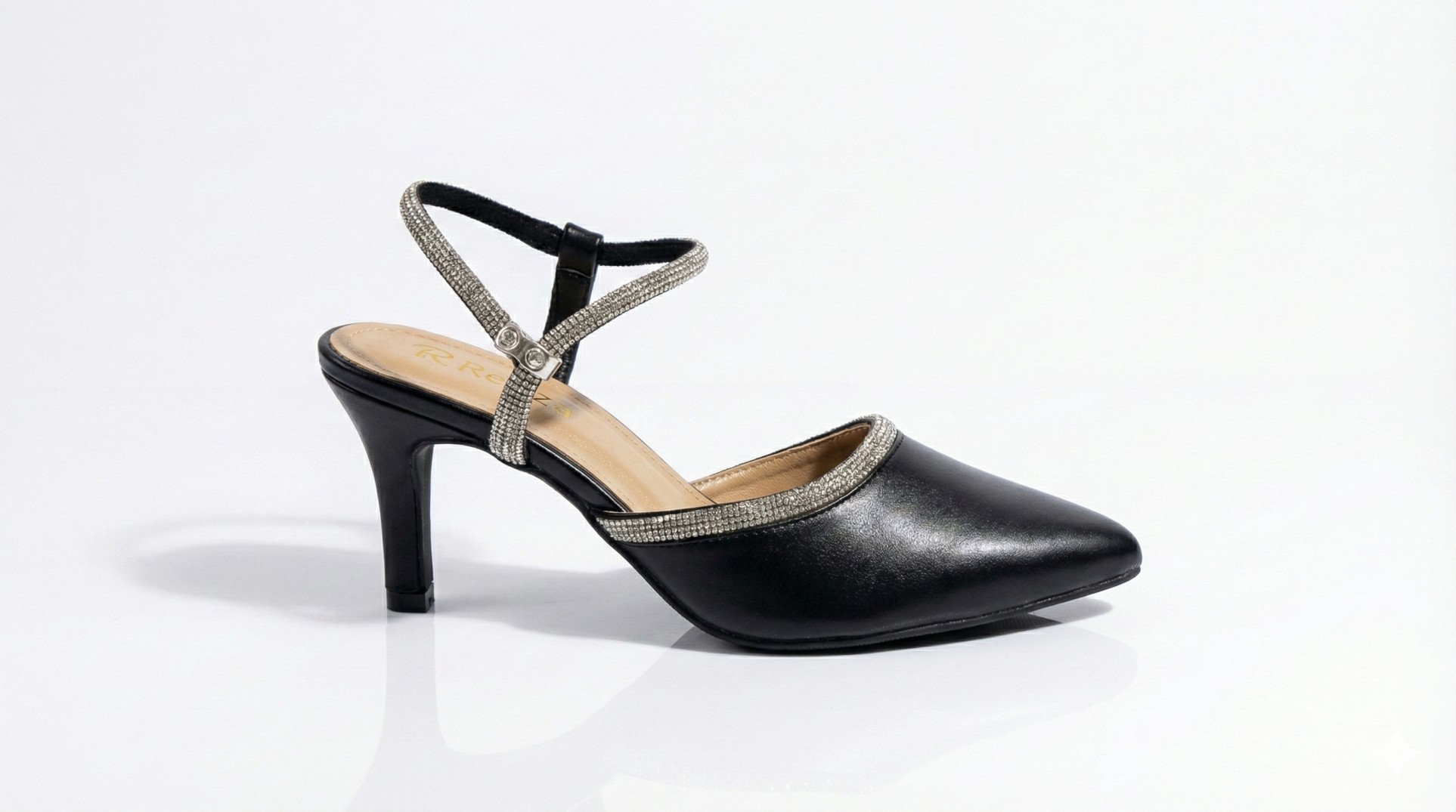 These elegant black pointed-toe heels feature sparkling rhinestone straps and a comfortable kitten heel, perfect for adding a touch of glamour to any evening outfit.