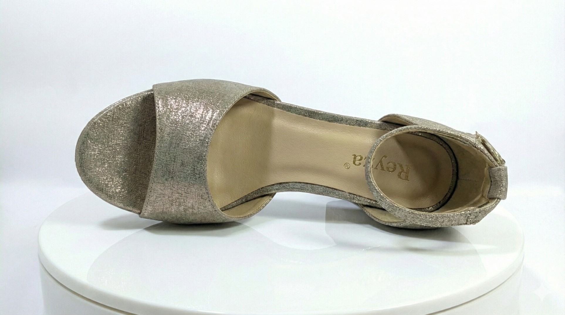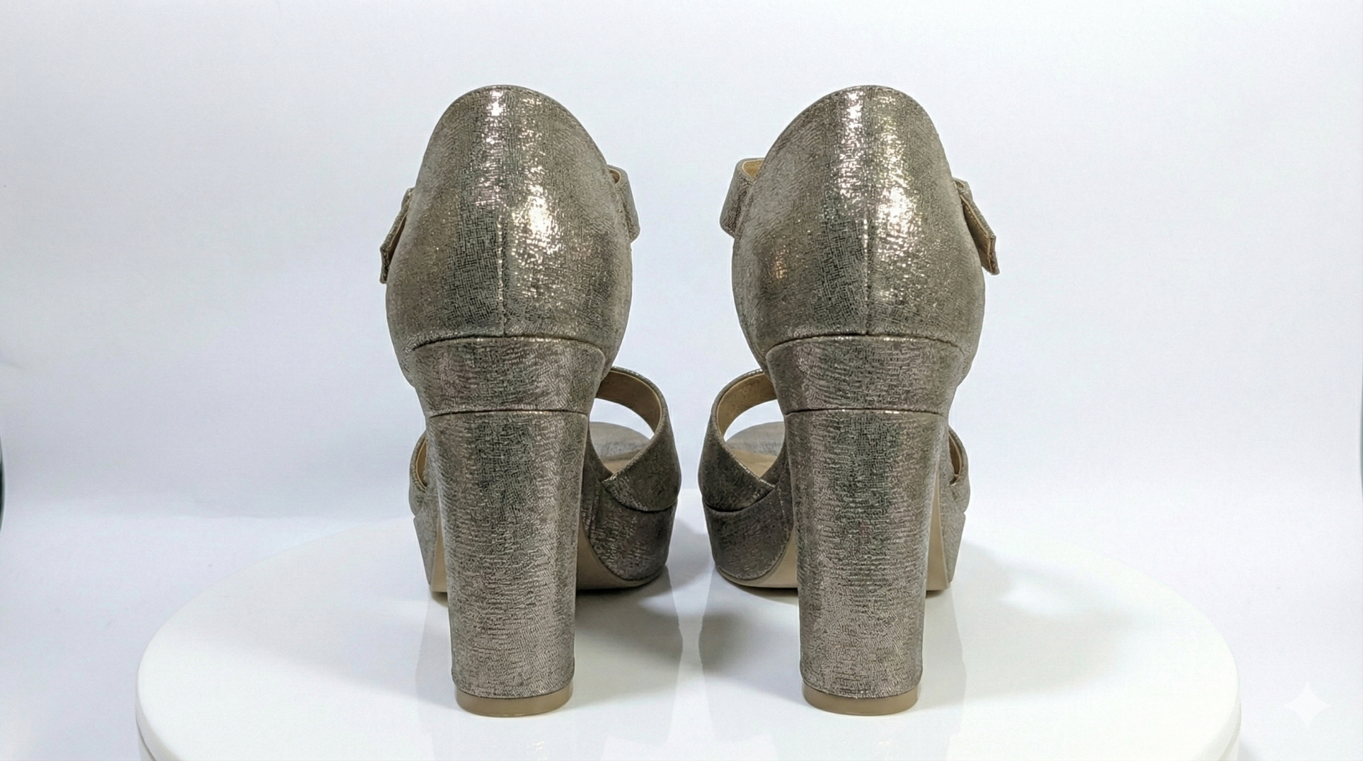 The textured, light-catching metallic finish adds a sophisticated sparkle to any ensemble, making them the ideal choice for weddings, galas, or festive celebrations. The adjustable ankle strap with a silver-tone buckle ensures a secure, personalized fit, while the padded insole provides the comfort needed to stay on your feet from the first toast to the last dance. Pair them with a floor-length gown or tailored trousers to make a lasting impression.